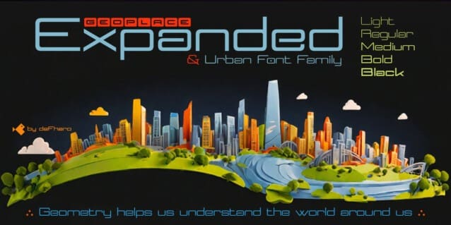 Geoplace Extended Font, an expanded proportion sans serif typeface family, imbued with futuristic urban style and technological inspiration, reflecting my passion for design and geometric precision to achieve unique aesthetics and exceptional legibility.