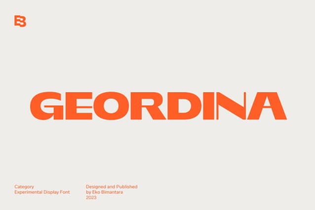 Geordina Font is an experimental display font characterized by its bold sans-serif style with high contrast and a unique design. It is an ideal choice for various design applications that require a standout display font. Geordina Font excels in display use, large-size applications, headers, and diverse layout designs, making it perfect for logos, websites, brand identities, product packaging, and a wide spectrum of graphic design and creative projects. Its unique and high-contrast features set it apart, ensuring that Geordina makes a bold and distinctive statement in your designs.