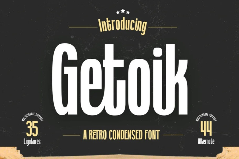 Introducing Getoik Display Font, the Retro Condensed Font that will take your designs to the next level. With its clean and smooth edges, this font is perfect for any design project. Getoik features multiple ligatures and alternates, giving you even more design options to choose from.