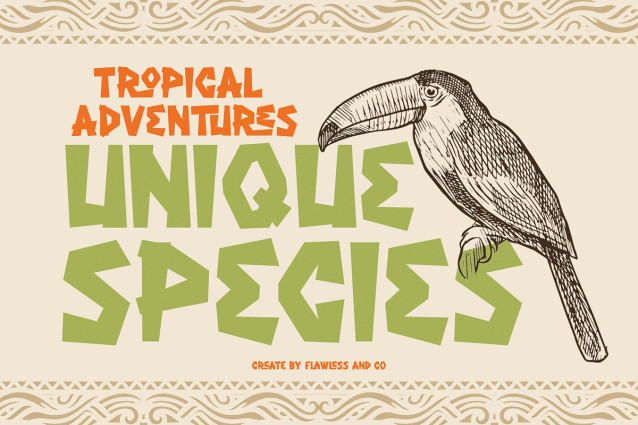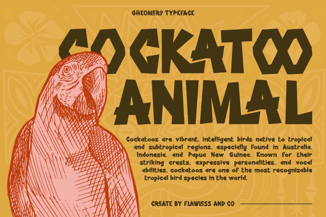 Gheomera Display Font is a bold ethnic display font inspired by tribal carvings, folk culture, and the spirit of ancient celebration. With its sharp angles, rhythmic letterforms, and striking ligatures, this font brings high energy and cultural flavor to any design. Perfect for posters, music festivals, island-themed branding, Tiki bar logos, apparel, packaging, and creative visuals that demand a bold, ethnic vibe—Gheomeraturns words into rhythm and style. Make your design beat with tradition, character, and wild creative expression — only with Gheomera.