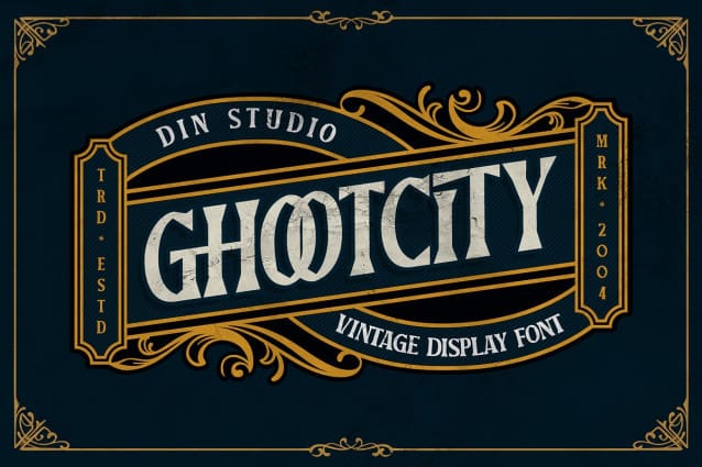 Ghootcity Vintage Font – a bold, vintage-themed display font that exudes strength and character. Crafted in uppercases with consistent letter proportions. Ghootcity also shows a noticeable contrast that adds depth and visual interest. Its sharp-cornered outline enhances the font’s striking appearance, while the vintage style brings a nostalgic touch to your designs. As an extra, this font gives ornaments.