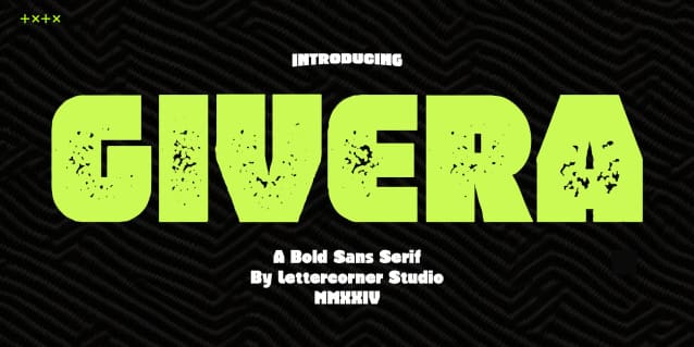 Givera Font is a Display font published and design by Lettercorner Studio Inspired by the big board sign in every corner of the town and shadows me every time I close my eyes when I tried to sleep. well Givera Font is a strong and bold typeface it has multilingual language, it useful for your a cool and coolest project up next. Try this font on any surface it will looks Stunning!. happy creating. hope you like it!