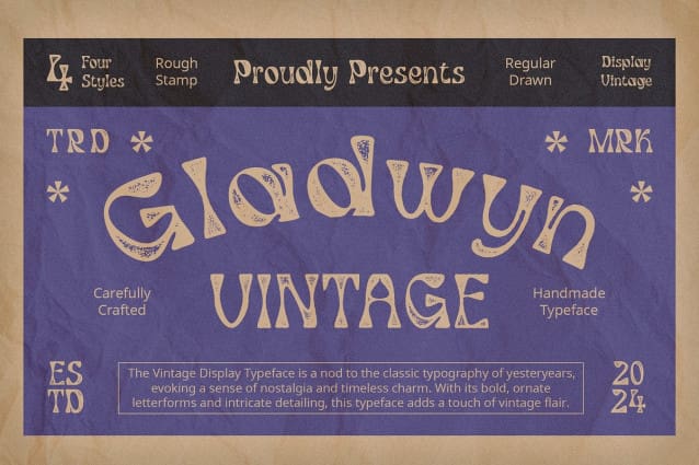 Gladwyn Vintage Stamp Font exudes a playful and funky aesthetic, characterized by its unique drawn rough stamp effect. Each letter captures the essence of retro charm with a modern twist.