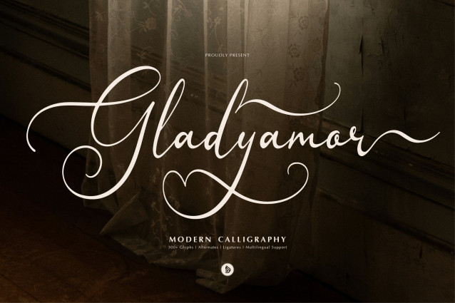 Gladyamor Font | Modern Calligraphy, from Denustudios, suitable for any projects such as: logos, branding projects, homeware designs, product packaging, mugs, quotes, posters, shopping bags, t-shirts, book covers, name card, invitation cards, greeting cards, label, photography, watermark, special events, and all your other lovely projects that need a Modern Calligraphy taste.