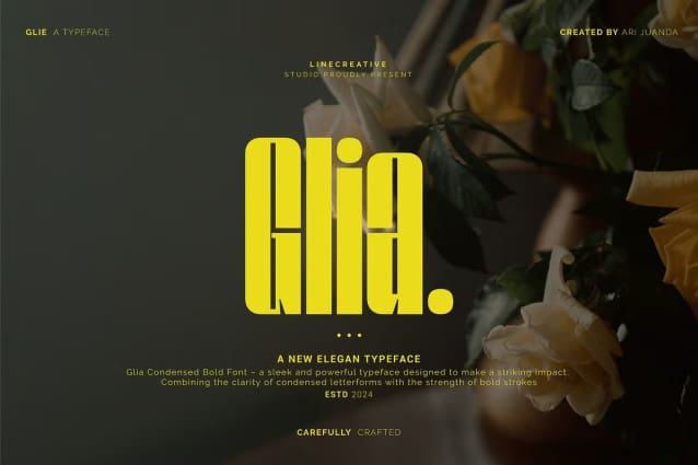 Glia Font – Condensed Bold Font, a sleek and powerful typeface designed to make a striking impact. Combining the clarity of condensed letterforms with the strength of bold strokes, It gives the impression of being clean and extremely ellegant.