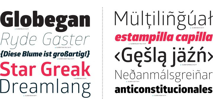 The Glober Sans Serif font family includes 18 weights – nine uprights with nine italics. It is characterized by excellent legibility in both – web & print design areas, well-finished geometric designs, optimized kerning, excellent web-font performance and legibility etc.