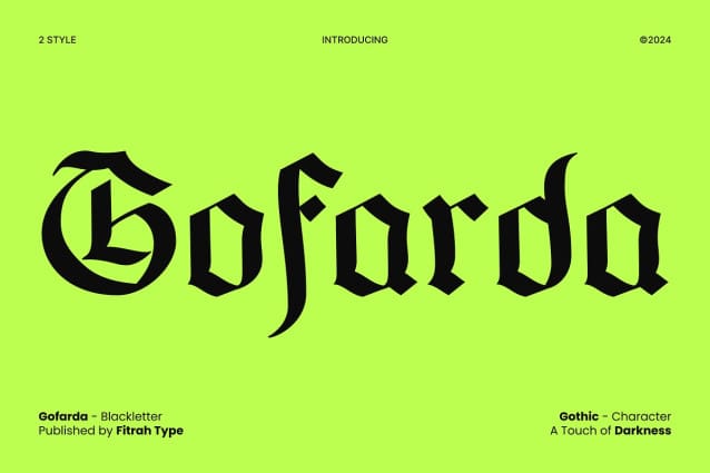Gofarda Gothic Font is the newest typeface with a simple Blackletter style. There are two styles of font Regular and Distort styles. The entire typography has been designed to work on large sizes. This font is good to use on posters, zines, stickers, and t-shirts.