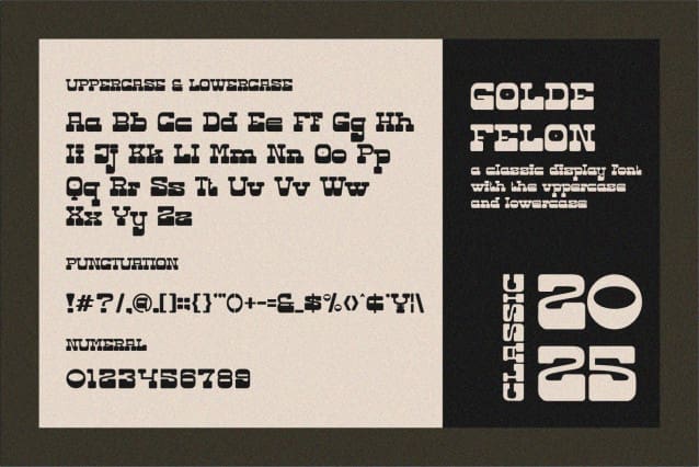 Golde Felon New Unique Display Font is a modern, trendy, bouncy and cute display font. It has a unique character with wood theme. It is perfect to be combined with invitation card designs, company logos, movie titles, movie names, business cards, book titles, brand names and various other designs.