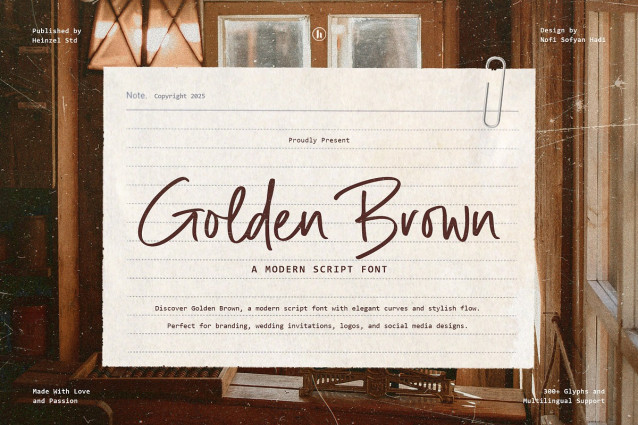 Golden Brown Script Font is a modern script font that blends elegance with a warm, handwritten charm. Featuring smooth curves, natural strokes, and stylish flow, this font delivers a refined yet friendly feel. Its graceful letterforms make Golden Brown perfect for branding projects, wedding invitations, logos, packaging, quotes, and social media designs. Designed to feel personal and expressive, Golden Brown adds a timeless and sophisticated touch to any creative work while remaining easy to read and visually appealing.