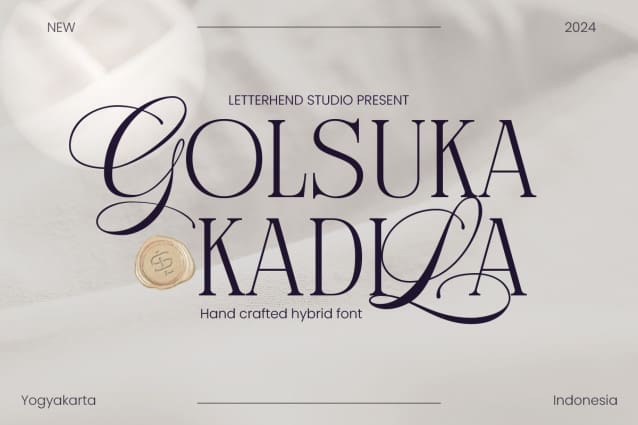 Golsuka Kadila Font, a handcrafted serif-script hybrid typeface that blends classic elegance with modern flair. Featuring timeless script uppercase letters and stylish serif lowercase, it’s perfect for everything from invitations and logos to magazines, books, wedding cards, packaging, fashion, and more. Make your designs stand out with this timeless, versatile font.