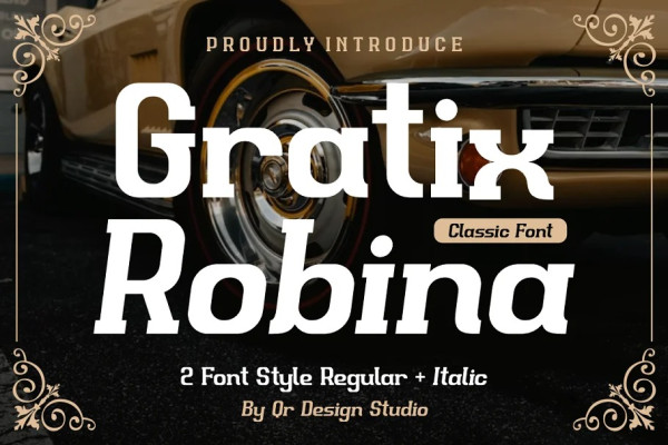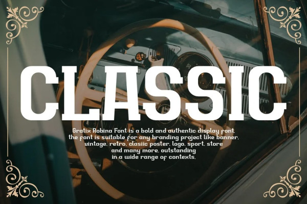 Gratix Robina Font – Classic Font is a bold and authentic display font. The font is suitable for any branding project like retro, vintage, poster, classic, logo, sport, and many more. Outstanding in a wide range of contexts.