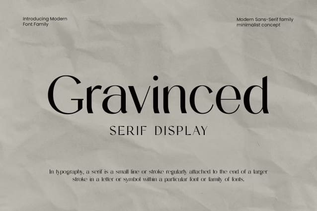 Gravinced Font – Modern Serif Display Font Family. The modern display font feels beautiful classy, elegant, and stylish. This font is ideally suited for a wide variety of projects, such as signature, stationery, logo, wedding, typography quotes, magazine or book covers, website headers, branding, and more. Also, fashion-related branding or editorial design displays both masculine and feminine qualities.