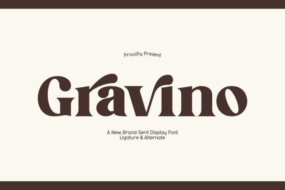 Gravino Font a new brand serif display font. The presentation highlights that the font includes special ligature and alternate characters, and its soft, chunky letterforms give it a friendly yet impactful