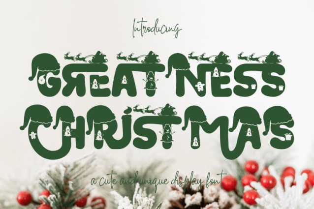 Greatness Christmas – Playful Font – Playful Christmas Display Font, a playful and festive Christmas display font designed to bring joy, warmth, and holiday spirit into your designs. This font features bold, rounded letterforms with soft curves and a friendly silhouette, enhanced by charming Christmas-themed details such as Santa hats, snowmen, reindeer, and decorative ornaments integrated directly into the characters. The overall style feels fun, cozy, and whimsical, making it instantly recognizable and highly engaging for seasonal projects. Greatness Christmas is perfect for Christmas posters, greeting cards, gift packaging, holiday branding, kids designs, social media graphics, apparel, and festive advertising. Its strong shapes ensure excellent readability, while the decorative ligatures add personality and storytelling charm to every word.