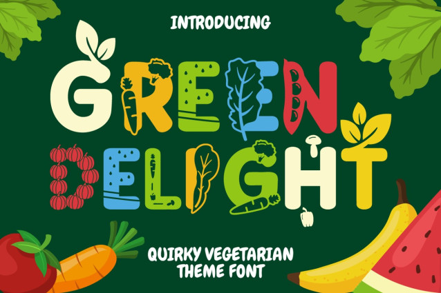 Green Delight Font, a quirky vegetarian-themed font that embodies the essence of freshness, health, and the vibrant world of fruits and vegetables. This display font, with its rounded edges and unique design, is crafted for those who are passionate about nature, wellness, and creativity. Each letter is infused with elements inspired by various greens – from leafy vegetables to succulent fruits – making it a perfect choice for projects related to children, crafting, or any fun and playful themes.