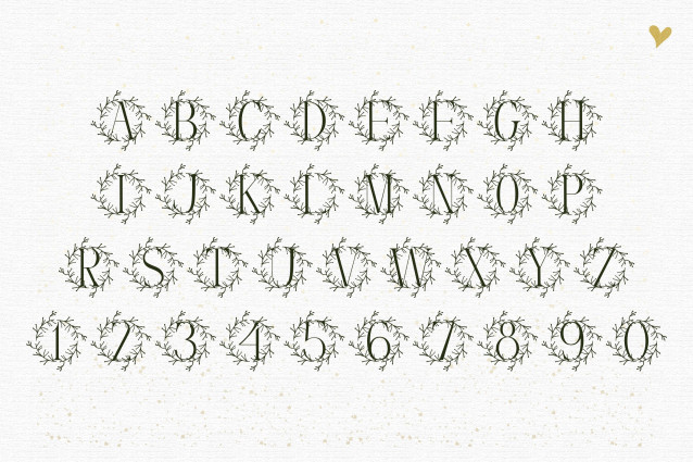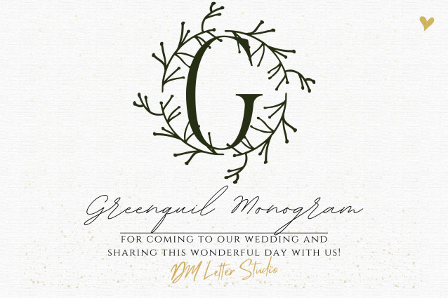 Greenquill Monogram Font is a refined serif monogram font accented with delicate greenery and quill-like flourishes. Each uppercase letter is carefully designed with botanical details, making it perfect for wedding stationery, boutique branding, packaging, and personalized projects. With its mix of timeless serif structure and organic elegance, Greenquill Monogram brings a sophisticated natural touch to your creative work.
