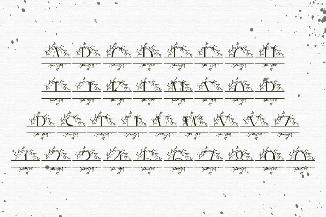 Greenquill Split Monogram Font is a sophisticated serif monogram font with elegant leafy accents and a split design for personalization. Each uppercase letter is framed with botanical quill-like details and includes a horizontal gap, allowing you to insert names, dates, or custom text with ease. Perfect for weddings, branding, signage, and Cricut projects, this font combines timeless serif elegance with organic natural beauty.