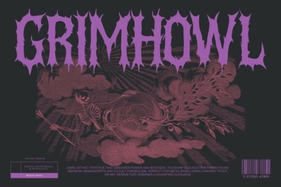 Grimhowl Font is an ALL CAPS gothic, blackletter typeface crafted to deliver a powerful, dark, and dramatic visual impact.Featuring sharp, spiked letterforms inspired by modern blackletter, dark fantasy art, and occult engravings, this typeface is designed to evoke mystery, intensity, and atmospheric depth. Every character brings a bold and haunting presence, making it ideal for extreme and expressive design projects.