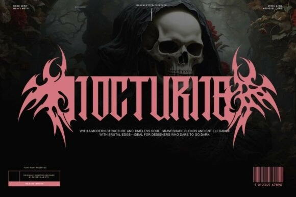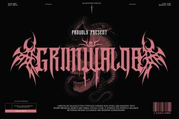 Grimvalde Font is a dark serif blackletter typeface designed with 364 glyphs and a wide range of alternate characters, offering maximum versatility for bold and gothic-inspired designs. Crafted for designers who dare to go dark, Grimvalde blends ancient medieval elegance with modern brutalist edge—perfect for metal band logos, horror titles, gothic fashion, tattoo art, and occult branding.