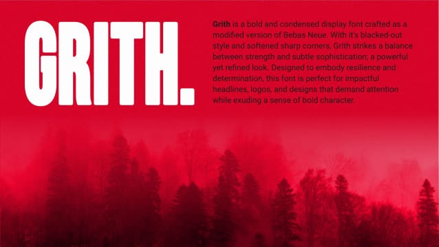 Grith Font is a bold and condensed display font crafted as a modified version of Bebas Neue. With it’s blacked-out style and softened sharp corners, Grith strikes a balance between strength and subtle sophistication; a powerful yet refined look. Designed to embody resilience and determination, this font is perfect for impactful headlines, logos, and designs that demand attention while exuding a sense of bold character.