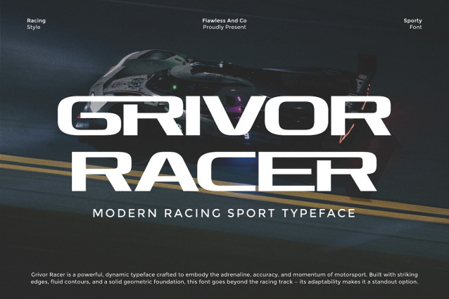 Grivor Racer Font is a bold and high-energy typeface designed to capture the speed, precision, and power of modern motorsport. With sharp cuts, aerodynamic curves, and a geometric build, this racing sport logo font is made to fuel adrenaline-driven designs. Perfectly balanced between aggressive style and versatile readability, Grivor Racer stands out not only on the track but also in branding, logos, posters, and sports-themed projects.