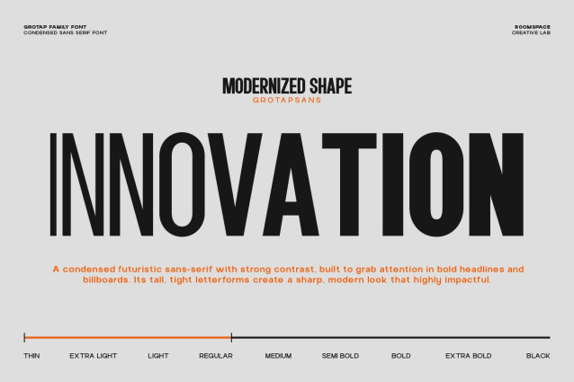 Grotap Font a condensed sans-serif font family with a bold, modern spirit. Designed for powerful headlines and clean contemporary branding, Grotap delivers sharp vertical rhythm and strong typographic presence. With 9 versatile weights, it adapts beautifully to editorial layouts, posters, packaging, and digital design projects, giving your work a confident, elevated look.