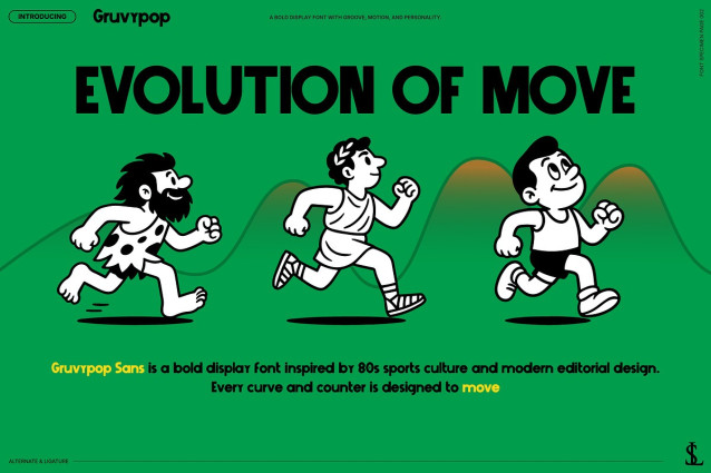 Gruvy Pop Sans Font is a bold display font inspired by 80s sports culture and modern editorial design. Every curve and counter is designed to move — bringing rhythm, energy, and attitude to your typography. Gruvy Pop blends retro athletic charm with geometric structure, creating a font that feels both nostalgic and fresh.