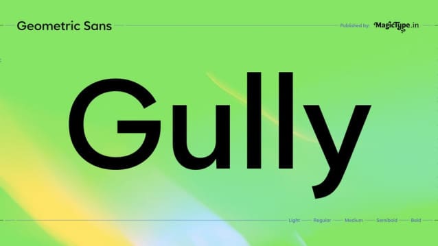 Gully Font Family is a low-contrast geometric type family. Glyphs have large x-height, higher ascenders than the cap height, dynamically angled sharp cuts at the terminals and optically corrected geometric closed counters. The typeface is versatile in terms of uses. The proportions are suitable for both; display and body type.