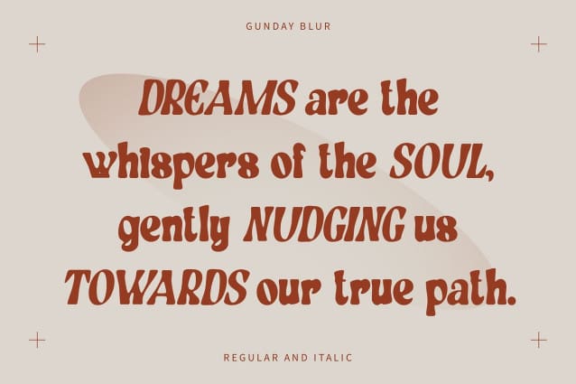 Elegance with a Modern Edge Gunday Blur’s fusion of retro-classic design and modern blur effect makes it ideal for projects that need a touch of nostalgic elegance combined with a fresh, sophisticated look. It’s a versatile font for creating impactful and stylish designs that resonate with both historical and contemporary sensibilities.