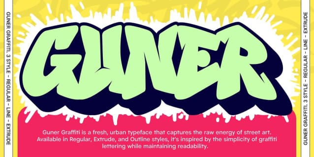 Guner Graffiti Font is a fresh, urban typeface that captures the raw energy of street art. Available in Regular, Extrude, and Outline styles, it’s inspired by the simplicity of graffiti lettering while maintaining readability. Designed for large-scale applications, Guner Graffiti is perfect for posters, zines, stickers, apparel, and bold branding. Whether you’re creating a streetwear aesthetic or eye-catching visuals, this font brings a rebellious yet clean graffiti vibe to any project.