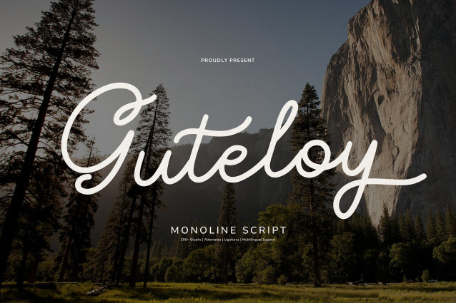 Guteloy Monoline Font, from Gracetypestudio, suitable for any projects such as: logos, branding projects, homeware designs, product packaging, mugs, quotes, posters, shopping bags, t-shirts, book covers, name card, invitation cards, greeting cards, label, photography, watermark, special events, and all your other lovely projects that need a Monoline Script taste.