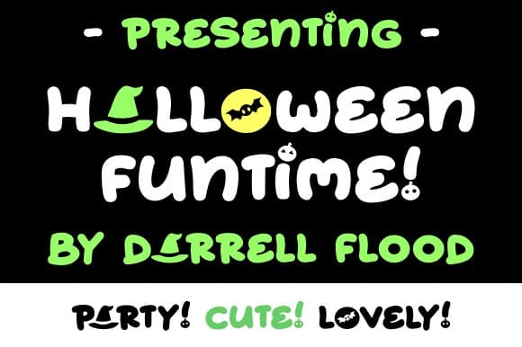 Halloween Funtime Font, a super fun and expressive Halloween font in a lovely, hand-drawn style. Includes little illustrative elements like bats, witch hats, and pumpkins in some of the letters. Perfect for Halloween celebrations and general family-friendly horror use!