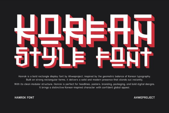 Designed to command attention, Hanrok works perfectly for headlines, posters, branding, logos, product packaging, K-pop themed designs, Asian cultural visuals, streetwear graphics, and impactful social media content. Its solid, symmetrical letterforms create a distinctive rhythm that instantly strengthens visual identity.
