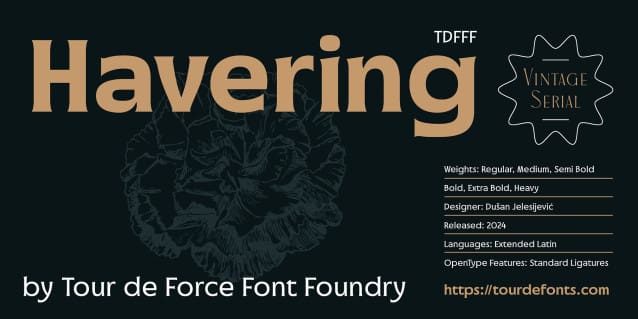 Havering Font Family, is another addition to Vintage Serial font families. Coming in 6 weights, It is display font family with gentle serifs in vintage manners. Opposite to the most common proportion of letters in fonts, Havering contain letters that are wide, condensed and with normal width. It was done with purpose in order to get more visual dynamic within words.