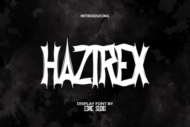 Haztrex Display Font is a rough display font with a black rock metal feel. Perfect for any design that requires a bold typeface, such as billboard, brand logo, business cards, cover album, embroidery designs, headers, heading, labels, posters, print on fabrics, spooky quotes, sticker, websites, and so on.
