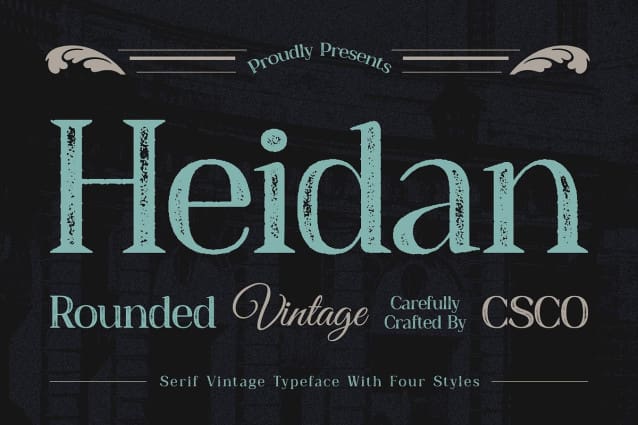 Vintage Elegance Redefined This font redefines vintage elegance with its distinctive high contrast serif, rounded stem ends, and handcrafted effects. Perfect for vintage-themed displays, this font adds a touch of nostalgia and sophistication to any design endeavor. Step back in time with Heidan Rounded Vintage and elevate your projects with timeless charm.