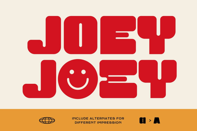 Its blocky shapes are softened by rounded corners, feature unique cutout details, geometric quirks, and alternate forms that keep the design fresh and versatile. Ligatures and stylistic alternates add extra character, while a few glyphs replace letters with fun icons (like a smiley face) for a whimsical twist.