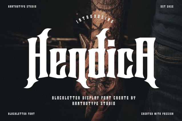 Hendica Font is blackletter font inspire by simple antique style. antique is a perfectly choice for any creative endeavor, lifestyle design such as logotype, advertisements, watermark on photography, stationery, branding project, display and magazine, invitation, corporate brand, product design, label, business project and many other project with medievel touch.