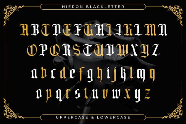 Hieron Blackletter Font is an incredibly authentic and daring blackletter font. Add this font to your favorite creative ideas and notice how it makes them stand out! Hieron Blackletter is an incredibly authentic and daring blackletter font. Its stylish alternations and ligatures make this font the perfect partner for any project.