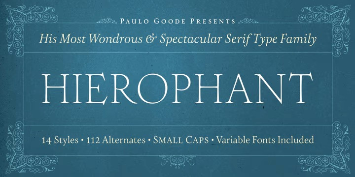 Hierophant Serif Font is a humanist serif type family that has the heritage of classic Old Style and Transitional type while having the crisp lines and functionality of contemporary fonts. Its defining features include a high-contrast combined with diagonal stress, along with pinched stems and horizontals. This gives Hierophant a distinctive hand-drawn feel which also reflects the strong influence of the work of 16th century calligrapher Giovanni Francesco Cresci upon this family.
