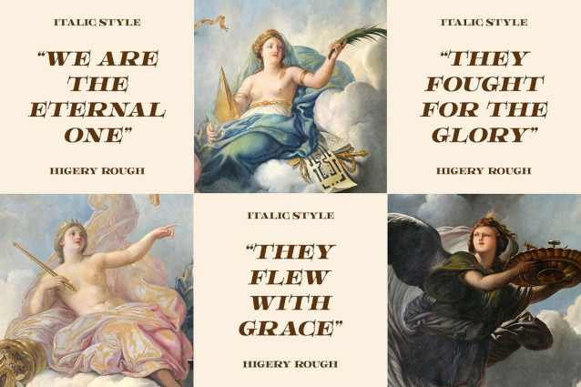 Versatile and Impactful for Creative Applications Higery Rough offers classic serif sophistication with a rugged edge, making it perfect for designers seeking a balance between tradition and bold expression. It works seamlessly in both print and digital designs, maintaining its strong presence across various mediums. With its elegant yet edgy personality, Higery Rough is the ideal choice for projects that demand a striking and confident visual identity.
