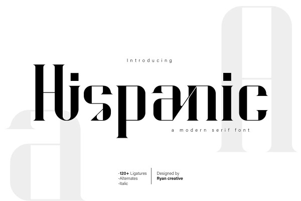 Hispanic fonts that have strong looking designs. In this font there is an additional taper at each end of the letter so that it seems more concentrated. Hispanic has more than 120 Ligatures that you can use in both modern and contemporary designs, and are suitable for use in a variety of fashion media, posters, model magazines, typography, promotions and other digital media.