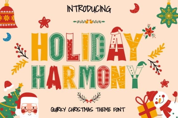 Holiday Harmony Font, a quirky Christmas-themed font that encapsulates the joy and spirit of the holiday season. This display font, crafted with precision, is unique and playful, making it a perfect choice for a wide range of festive applications. Each letter is designed with elements reminiscent of Christmas – from jolly Santa Claus to graceful reindeers, snowflakes to gifts wrapped with love.