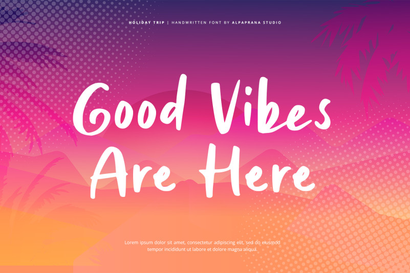 Holiday Trip Font is a handwritten font with authentic and playful feels. It will be perfectly used for Branding, Logo Design, Lettering, Logotype, Clothing, Poster, magazine, packaging, posters, shopping bags, t-shirts, book covers, photography, special events and other design project.