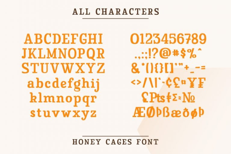 Honey Cages Font is a lovely display serif font in thick weights to show friendly, expressive, motional, balanced nuances between functionality and creativity. Generally, the letter shapes are round with consistent heights and wide spaces. There are also curved wipes on some of the letters’ edges to add decorative styles. Use Honey Cages for big-sized texts for a legibility reason. This font comes with some lovely features for you to enjoy.