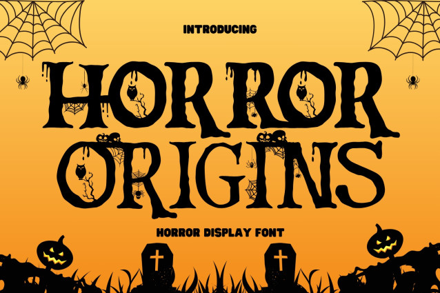 Horror Origins Font – a cute Halloween font with ghosts, spiders and cobwebs. It’s all caps serif font with spooky and scary vibes. This is special font for Halloween theme. This font has some ligatures to give more options in designing. Perfect for Halloween designs, logos, branding, packaging, apparel, cards, posters, quotes, social media posts, stickers and much more!