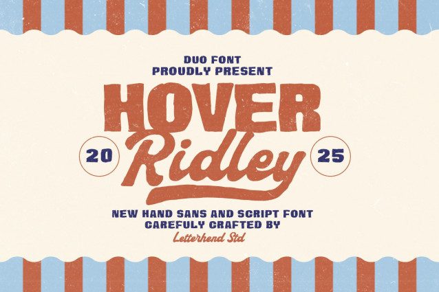 Hover Ridley Font Duo is a bold hand-drawn duo font that combines a chunky sans with a smooth script, creating a nostalgic yet lively look. Its rustic texture and retro curves bring back vintage fairground and old signage vibes, perfect for logos, posters, packaging, or any design that needs a handcrafted and adventurous spirit. The balance between the sturdy sans and flowing script gives every layout a dynamic, friendly energy that feels both timeless and approachable