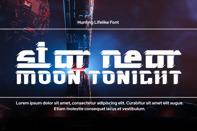 Hunting Lifelike – Futuristic Font is a futuristic display font that embodies speed, power, and cutting-edge design. Its bold geometric forms and sharp angular cuts deliver a strong high-tech aesthetic, perfect for projects that demand a modern and energetic look. Inspired by sci-fi and cyberpunk culture, this font injects a sense of innovation and futuristic identity into your designs. Ideal for sci-fi posters, video game titles, technology branding, album covers, and cinematic visuals, Hunting Lifelike ensures your typography makes a bold statement.