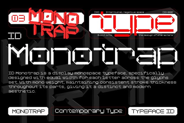 ID Monotrap Font is a display monospace typeface, specifically designed with equal width for each letter across the glyphs set. With mono weight, maintaining consistent stroke thickness throughout its parts, giving it a distinct and modern aesthetic.