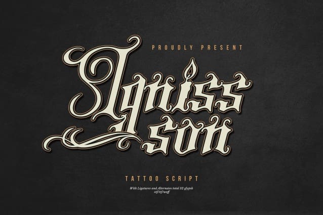 This font is used only for demos (Demo license). If you want to use this font for commercial use please contact: https://creativemarket.com/Denustudios/281163003-Igniss-Son-Tattoo-Script-Font?u=fontlot123